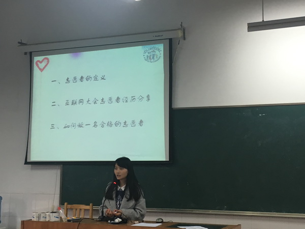庄俊伟老师结合做互联网大会志愿者的经历着重从志愿者的定义、参加互联网大会的志愿者经历分享和如何做一名合格的志愿者三方面进行授课。