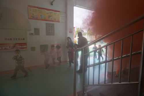 随着急速的“笛”声,每个班级的幼儿都在本班老师的组织下迅速排队,用湿毛巾、捂住口鼻,弯着腰,手扶楼梯的栏杆,不吵不闹,秩序井然,按照本班的疏散路线有秩序地撤离。历时3分35秒,幼儿全部安全的撤离到操场。各班教师清点人数后向总指挥示意。紧接着,消防车拉响着警报开进幼儿园,向幼儿演示喷雾水枪的威力。幼儿们看到消防叔叔高空喷水情绪一下子平稳了,忍不住连声喊“消防叔叔真棒!加油!”现场,消防员还演示了用干粉灭火器灭火的全过程,全园教职工学习并演练。