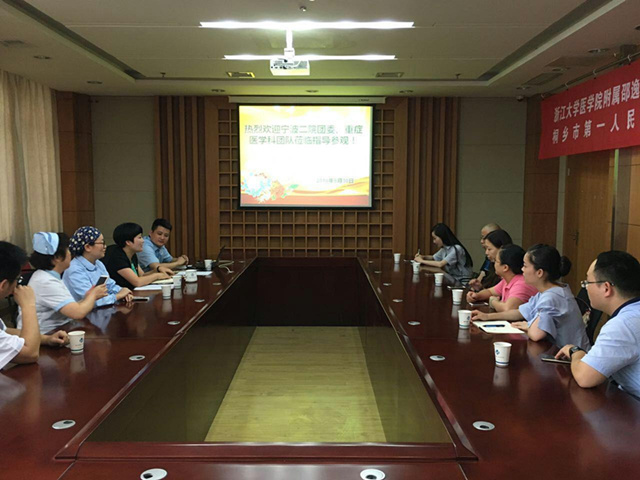 原来他们来自宁波市第二医院。宁波市第二医院重症医学科(以下称ICU)是“省级青年文明号”,几年来在此基础上不断加强科室建设,快速发展,今年更是百尺竿头,着手争创“国家级青年文明号”。得知我市一院ICU在2014年成功争创“国家级青年文明号”,本着取经纳谏,互通有无的精神,由宁波二院团委书记谢瑜硕带队,ICU主任许兆军、护士长房君及青年文明号的几位主要负责人来到了桐乡,市一院团委书记陈涛带领团委主要干部迎接谢书记一行。
