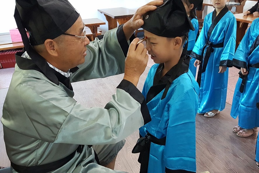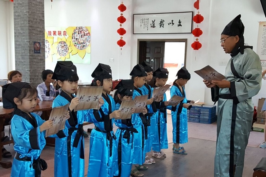 在仪式上,小朋友们穿着统一的汉服,在老师的带领下接受开蒙礼。开蒙礼遵循传统方式,先正衣冠,后明事理,再行拜师礼,在孩子们心中播撒下了一颗尊师重教的种子。老师们为学童点上“聪明记”,教孩子们写下了人生第一个“人”字,然后带领小朋友诵读《弟子规》。最后,村委工作人员还为现场的小朋友们送上了象征智慧、吉祥的“智慧笔”和“聪明蛋”,并祝愿他们在今后的学习道路上智慧好学、健康快乐。