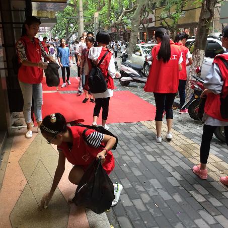 我们先在自己的校园大扫除,有的扫落叶、有的擦橱窗、有的捡草坪的垃圾,半个小时之后,校园变得非常整洁。接着我们走出校园,来到街道,我们逆向而行,我们弯腰低头,但是我们身上的那抹红却是那么耀眼和光亮,我们的行为引来大街上很多人的称赞和围观,有一位阿姨很开心的说:做学生,就应该这样。那时候,我觉得我们的行为是多么有意义。