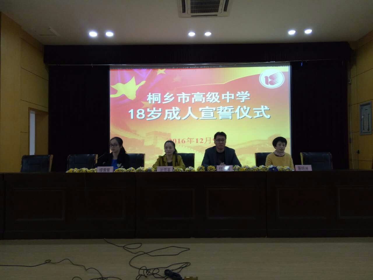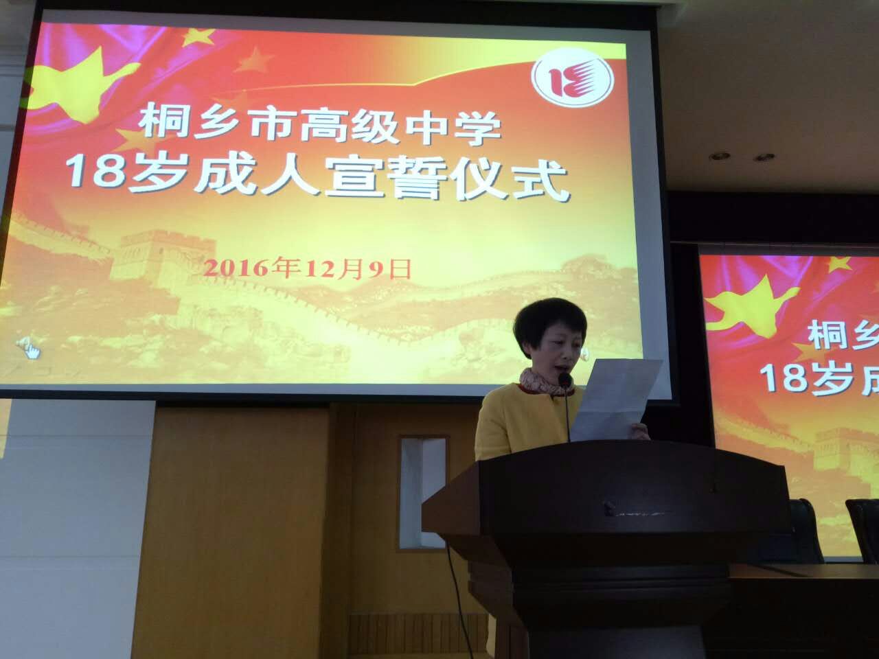 “我是中华人民共和国公民,在十八岁成年之际,面对国旗、庄严宣誓:捍卫神圣宪法,维护法律尊严;履行公民义务……”嘹亮的誓词回荡在冬季校园,这是2016年桐乡市高级中学高三学子在成人仪式的青春誓言。
