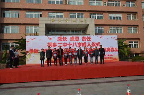 十八岁,朝气蓬勃如旭日一般的妙龄,清新芬芳如甘露般的年华。十八岁的足迹,延伸着无限美好的追求;十八岁的翅膀,承载着热烈的希望与梦想。12月30日下午,由桐乡二中团委主办,崇福镇普法办、崇福镇禁毒办协办的桐乡二中2016年十八岁成人仪式在桐乡二中的科技楼广场上隆重举行!本次成人礼以“遵纪守法,真爱生命,远离毒品”为主题。