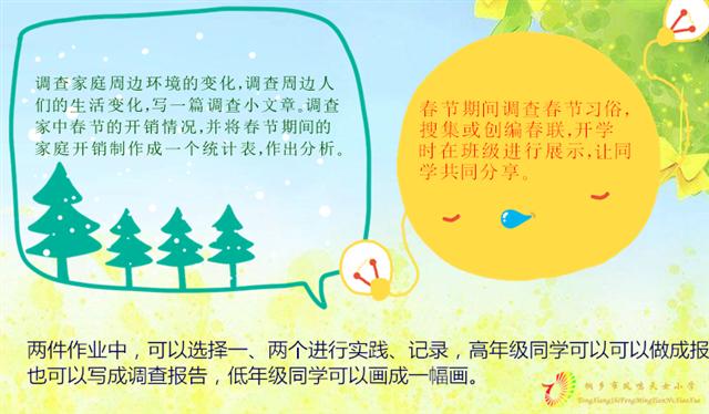 在上个学期结束时,凤鸣天女小学的孩子们领到了一份别样的寒假实践作业。这份作业里既有理性的调查研究,也有有趣的节日探秘。高年级的孩子可以做成报刊,也可以写成调查报告,低年级的孩子可以画成一幅画。 开学时,学生都积极上交了自己的作品,班主任老师组织孩子们评出了班级优秀作品。经过学校少先队大队部的甄选,选取了部分进行了全校性的展出。低年级的作品美观又精致,高年级的作品蕴含了丰富的春节文化知识。不同年级不同作品,大大提高了学生对艺术的感受和欣赏水平。