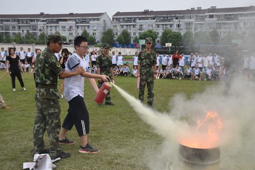 三个下午,每天都有不同的训练内容:第一天主要是列队训练;第二天下午进行了火灾逃生演习,将军训活动推向高潮。教官们为学员们讲解了灭火器的使用方法,并进行了亲自演示。很多同学摩拳擦掌,跃跃欲试,也成功扑灭了大火。第三天下午各班在操场上按序列队,进行会操展示,同学们以饱满的精神,整齐的步伐和响亮的口号接受检阅和表彰。会操展示结束后,全体学生向教官表示感谢,并由代表向教官们赠送了锦旗。