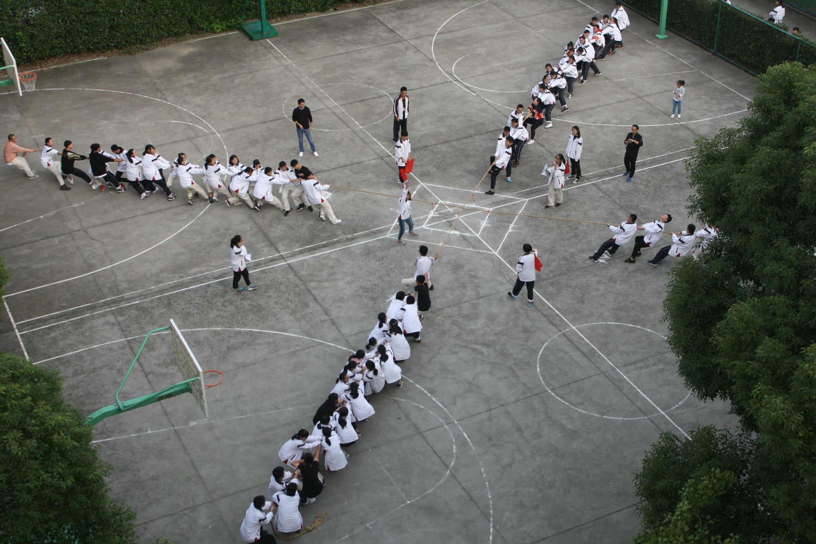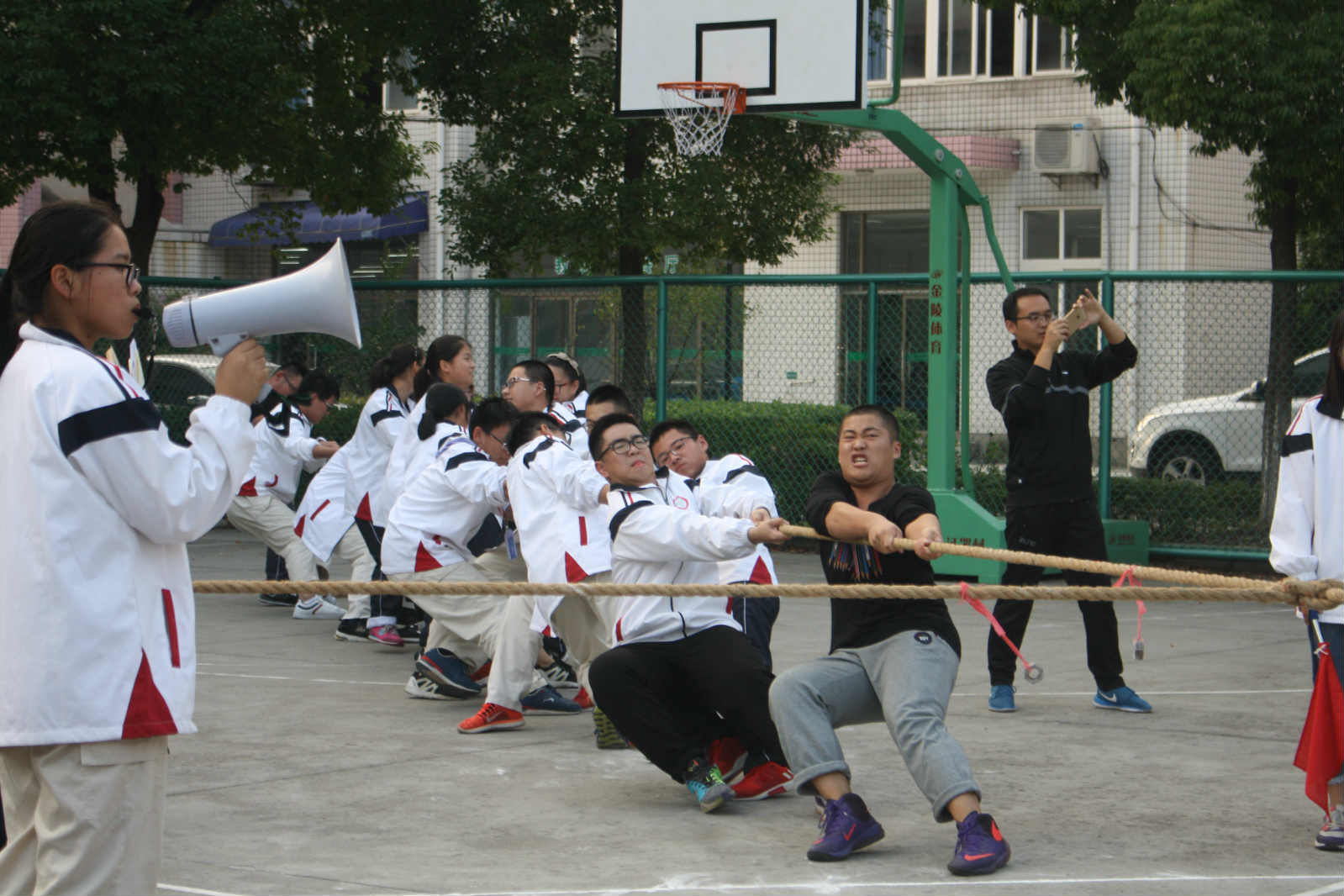 经历了激烈的预赛,11月8日终于迎来了激动人心的决赛。水泥篮球场上,只见进入决赛的四个班的参赛选手个个摩拳擦掌,交错排列,誓要打败对手,班主任们纷纷在旁为队员们加油鼓劲。随着一声哨声,“一二三……”同学们喊着口号,身体后倾,使劲往后拉。看那红绳,向你们班移去了,我们班再加把劲,赶紧拉过来。四方力量相互交错,你来我往,好不热闹。场上的人出力,场下的人也没闲着,“八班加油……!”“一二三,加油!”加油声响彻云霄。经过激励的角逐,最终高一(14)班获得了本次比赛的第一名。