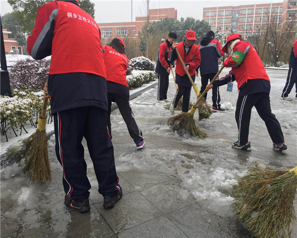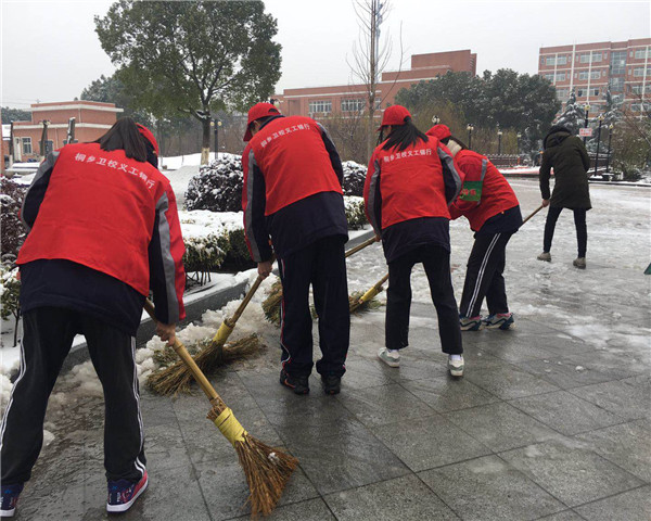 2018年1月25日,一场大雪如期而至,将桐乡卫校的校园装扮得银装素裹,瑞雪很美,但也给校园安全带来许多隐患,学校主干道及室外操场遍地积雪,严重影响了校园师生的出行安全。为尽快扫雪除冰、消除隐患,校团委快速组织义工银行的志愿者分赴学校各处进行扫雪除冰,确保师生在校的安全和教育教学工作的正常进行。