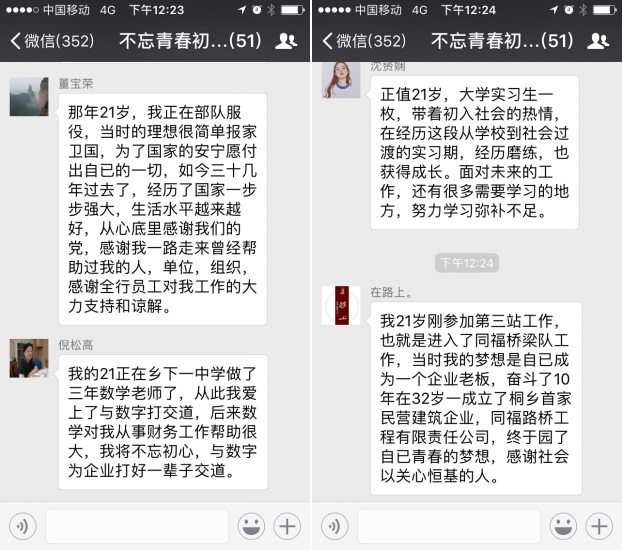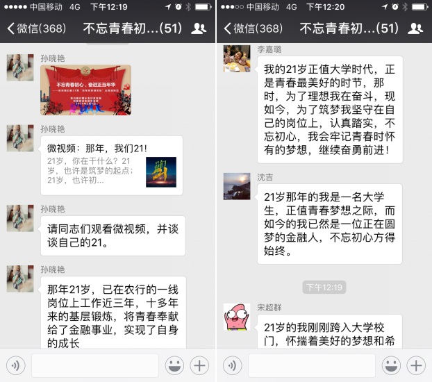那么,21岁的你,在干什么?5月4日,正值五四青年节,桐乡支行与党建共建单位恒基建设微信群热闹非凡,一场主题为“不忘青春初心,奋进正当年华”青年党员微论坛如火如荼展开,双方党员青年围绕“我们的21”,纷纷述说着自己的青春故事和梦想,表达着对当下的承诺与对未来的期许。