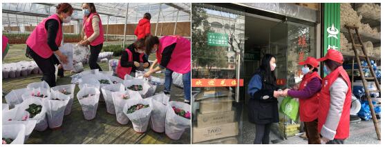 一边是农创园里志愿者们忙碌的身影,他们给农创客发放防疫宣传单,并协助电商主体打包整理,解决他们工人紧缺问题;另一边是大街小巷里,志愿者匆忙的脚步,他们为沿街开业的个体工商户发放爱心口罩,并告知他们营业注意事项,提醒各位个体户防疫不可松解;此外“万朵鲜花送前线”的活动也在进行中,志愿者们帮忙包装、打包盆栽花卉,分组为坚守在防疫一线的医护工作者和各个服务岗点的志愿者们送上温暖。
