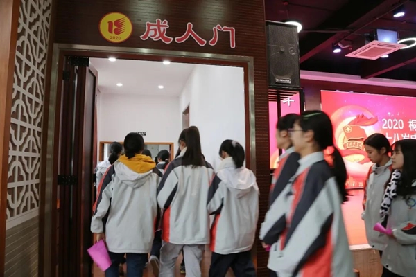 成人仪式在嘹亮的团歌中结束,会后,同学们有序通过成人门,宣告从这天起,将以成年人的身份踏进成人世界,做遵纪守法的好公民。