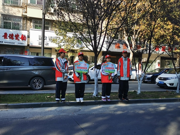 根据交警反馈,每当周六放学时,很多家长都会带着孩子直接穿越绿化带,由于树木的遮蔽,加上一中正处于十字路口,危险性非常大。因此从11月7日开始,每次放学高峰期,一中的安全小使者们就会身穿红色小马甲,手持“请勿穿越绿化带”的小牌子在绿化带前进行交通文明劝导。