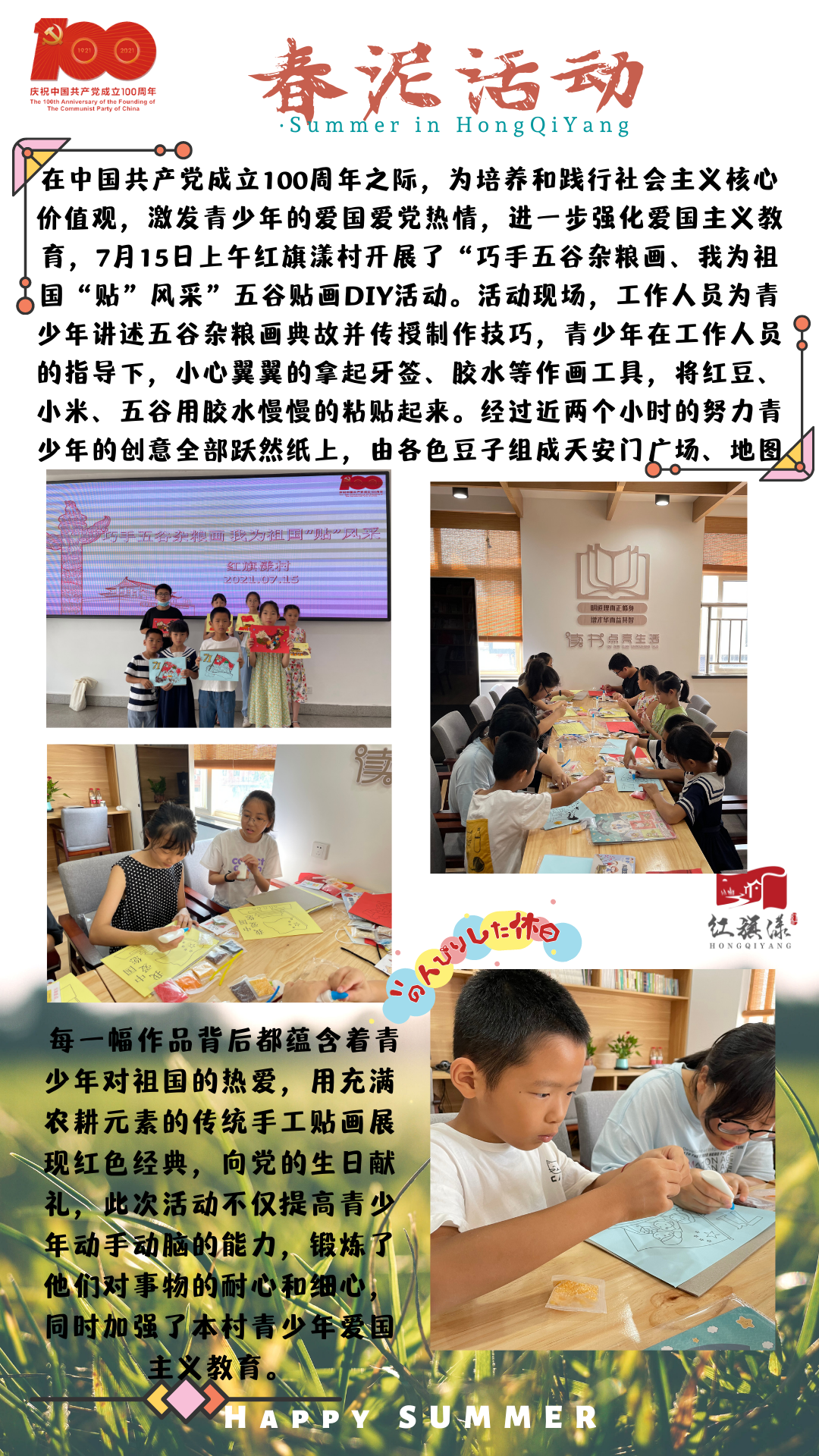 在中国共产党成立100周年之际,为培养和践行社会主义核心价值观,激发青少年的爱国爱党热情,进一步强化爱国主义教育,7月15日上午红旗漾村开展了“巧手五谷杂粮画、我为祖国“贴”风采”五谷贴画DIY活动。
