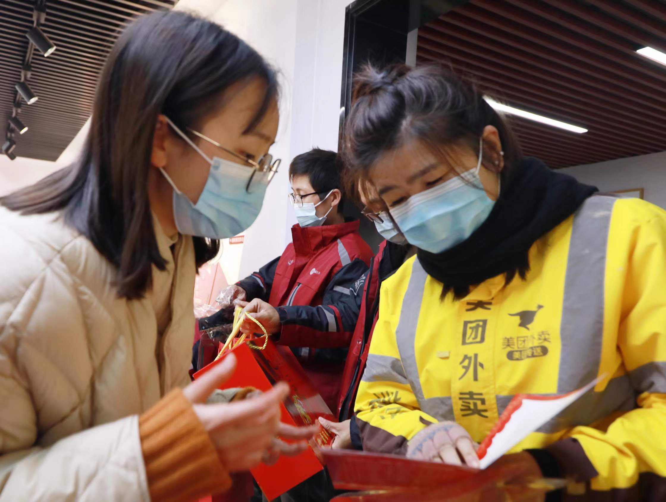 下午,在屠甸镇党群服务中心,屠甸镇团员青年干部正向十几位快递员、外卖小哥送上新春大礼包。这份新春大礼包包括年夜饭礼盒、围巾、福字以及流量卡等实用且有意义的物品。
