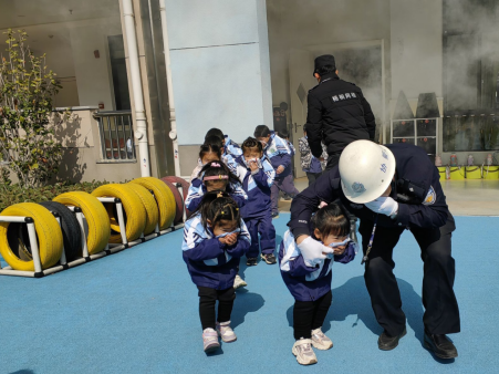 消防知识宣传过后,全园开展了一次消防安全演练。当火警响起,孩子们即刻拿好湿毛巾捂住口鼻,弯腰行走,在老师的带领下,快速、有序地沿逃生路线来到操场集中。