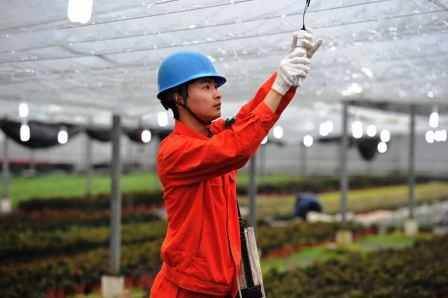 在大棚里,一盆盆绿叶、鲜花展新颜,好不春意盎然。李晋平按上开关,几排节能灯明晃晃地亮起来,放眼望去,有好几个灯不亮,沈建飞和陆惠锋分头行动,有的换上了新灯泡,有的重新拧上,几分钟后,灯光全部亮起。