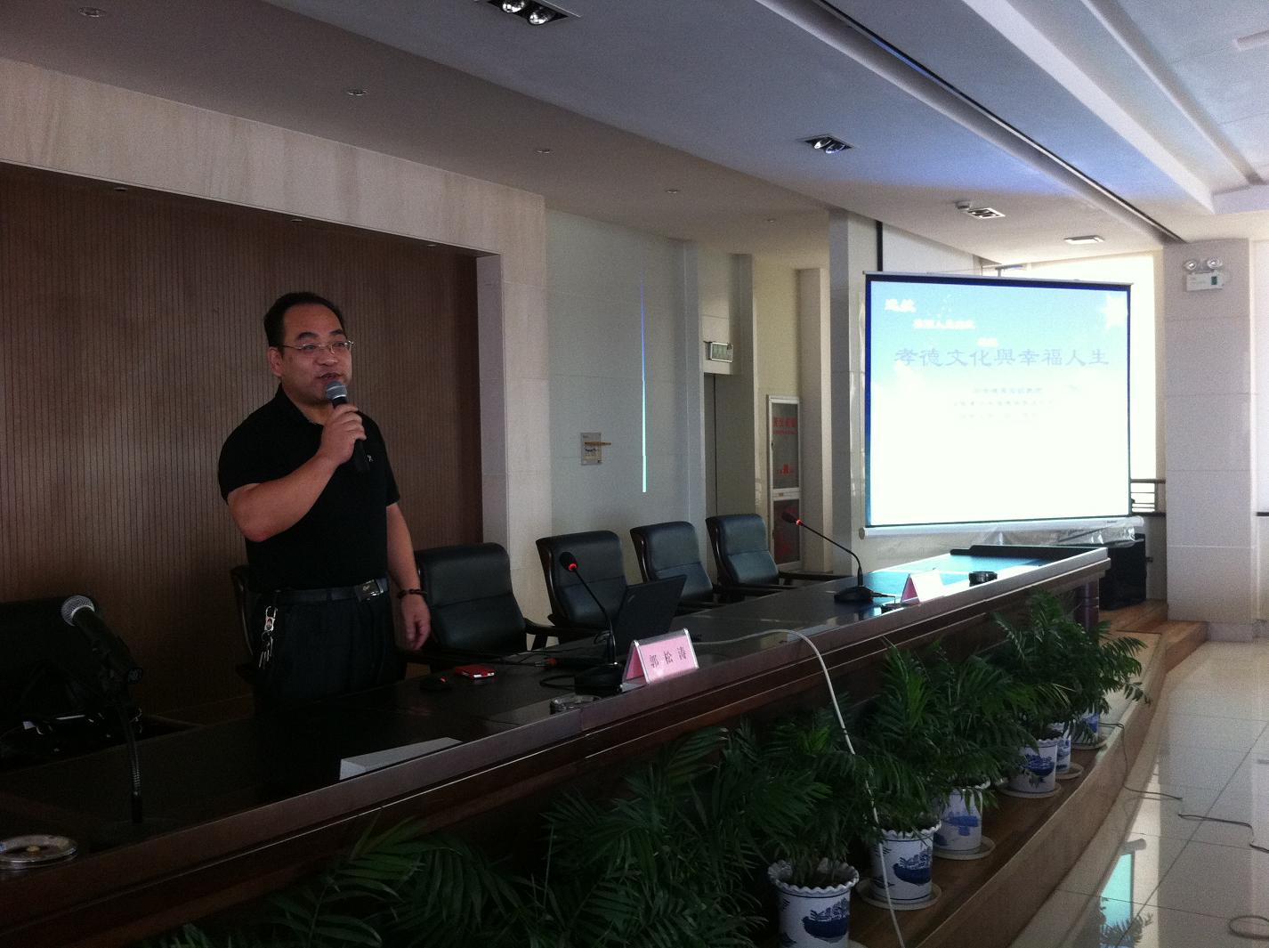 在桐乡市人力资源和社会保障局团委的倡导和筹划下,7月2日下午,一个以“德孝文化和幸福人生”为主题的讲座在舒缓的轻音乐中拉开帷幕。主讲的是茅盾中学政教处主任郭老师,一个资深的教师,一个德孝文化的传播者。