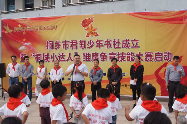 10月13日,时值少先队建队66周年,团市委、市少工委联合市教育局、市五水共治办、市书法家协会在乌镇镇民合小学举办君匋少年书社成立暨“桐城小达人”雏鹰争章技能大赛启动仪式,团省委副书记朱斌,团市委书记陈晓雷、副书记沈小炎,市五水共治办副主任夏根伟,乌镇镇副镇长周燕群等领导出席仪式,来自全市各小学阶段学校的大队辅导员们和民合小学的少先队员参加仪式。