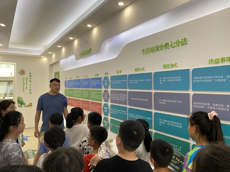 2021年7月15日下午,村委工作人员以及暑期实习大学生带领小朋友们来到了洲泉镇新洲景苑北区——生活垃圾分类体验中心,由专门负责讲解的老师为小朋友们讲解生活垃圾分类七分法的类别、范围以及投放方式,还为他们科普了哪些是厨余垃圾。