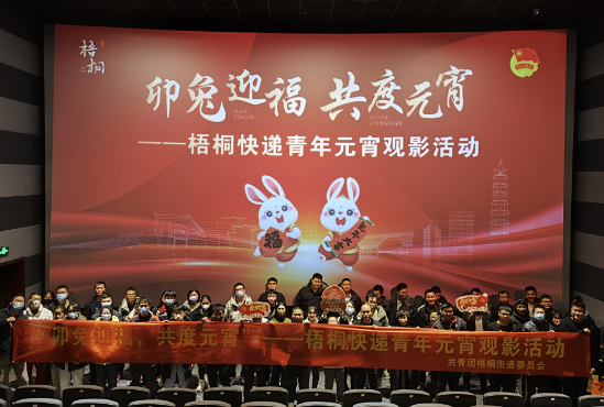 欢喜庆元宵,团团暖人心。为深入学习宣传贯彻党的二十大精神和习近平总书记关于青年工作的重要思想,弘扬中华优良传统文化,更好服务新兴领域青年。2月5日晚,梧桐街道团委组织顺丰快递员开展“卯兔迎福 共度元宵”梧桐快递青年元宵集体观影慰问活动,与快递小哥们一起感受元宵团圆、文明温暖的节日氛围。