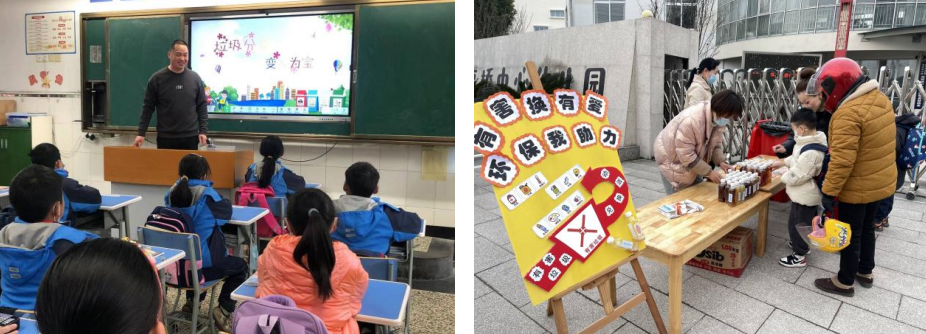 在高桥实验学校,老师利用生动有趣的PPT和动画视频深入浅出地向同学们讲解生活垃圾分类的重要意义。还通过“垃圾分类”大转盘、“垃圾分一分”等趣味游戏,进一步加深大家对垃圾分类的认识;同时以奖励机制提高同学们对垃圾分类的兴趣,鼓励大家把理论应用于实践,进一步学习和巩固垃圾分类知识。