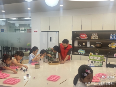 桐先锋志愿者给学生们讲解了咖啡渣手工皂的材料和制作要点。 先将皂基隔水加热将其融化,然后在溶剂里面加入植物油、食用色素、起泡剂和咖啡渣搅拌,随后倒入模具,最后脱模成形。在场的小朋友和家长都仔细听着讲解,按照步骤动手操作。桐先锋志愿者们也“趁热打铁”,为小朋友们讲解垃圾分类和环境保护的重要性。